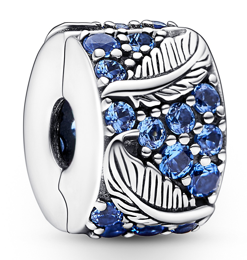 En vita fjädern är tecken på att din skyddsängel är i närheten och hjälper dig. Pandora Moments Curved Feather & Pave clip charm 792552C01 med fjäder är i sterling silver och smyckad med blåa kristaller och kubiska zirkonia stenar.