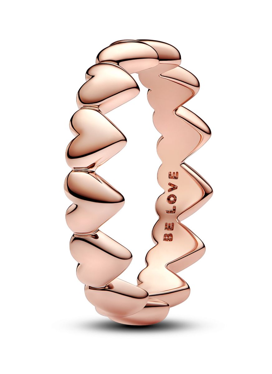 Bär kärleken med dig. Pandora Moments Row of Hearts 14k rose gold-plated ring 183427C00 har en yta full av hjärtan och texten "Be love" ingraverad inuti ringen. Den här söta hjärtringen är en fin present till dig själv eller en nära, och passar också som studentpresent. Hjärtringen är tillverkad av 14 karats roseguldpläterad metall. Du kan välja rätt storlek från dropp-down menyn. Pandora smycken levereras i tillverkarens egen ask.