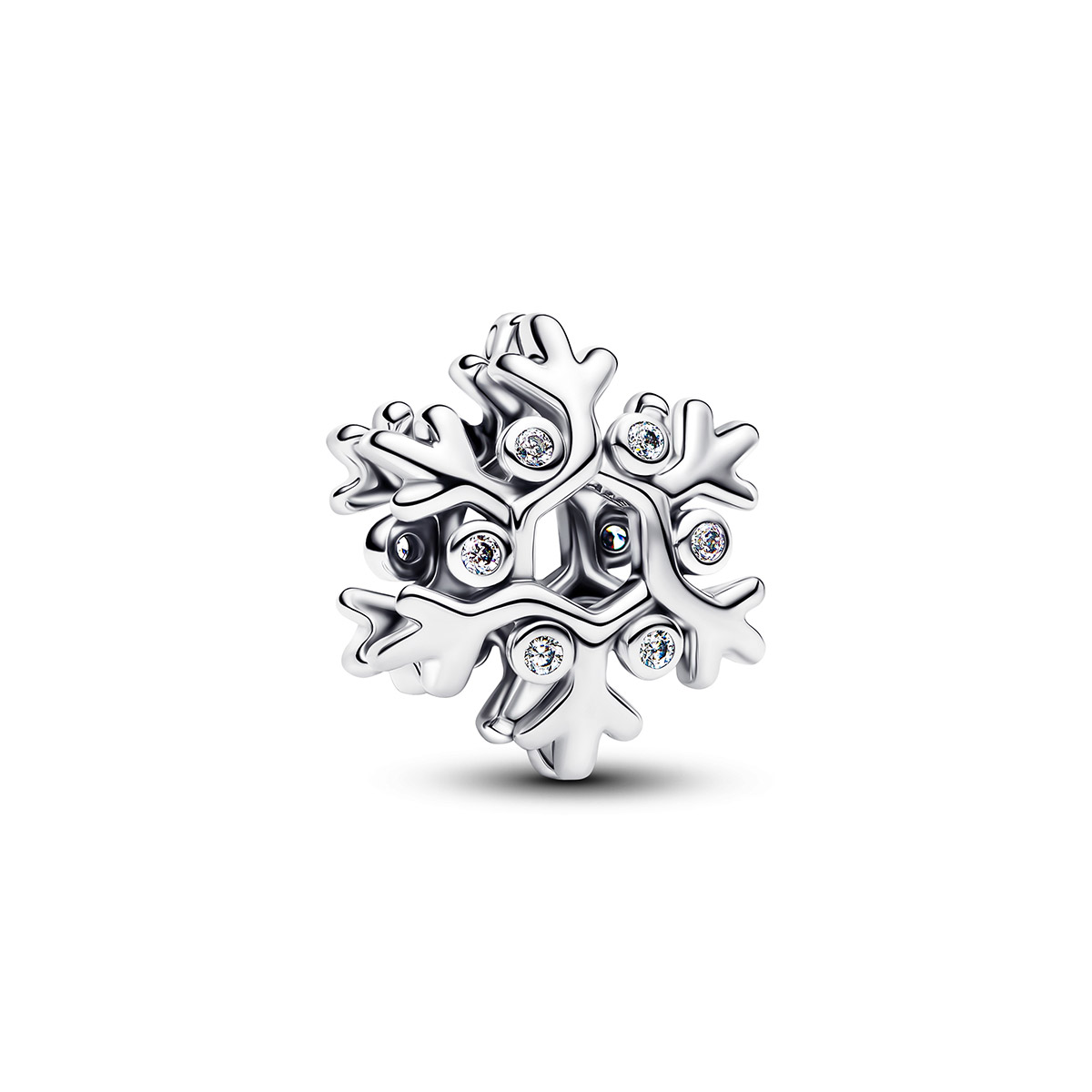 Ett smycke som glittrar som en vintermorgondagg – Pandora Moments-berlocken ger dina smycken en touch av iskristallgnistra. Berlocken glider genom hålet i berlocken på ditt Pandora Moments-halsband eller armband. Denna berlock i sterlingsilver har en tredimensionell snöflingedesign, prydd med glittrande klara stenar i spetsen på varje stift. Berlocken mäter 11,3 x 10 mm.