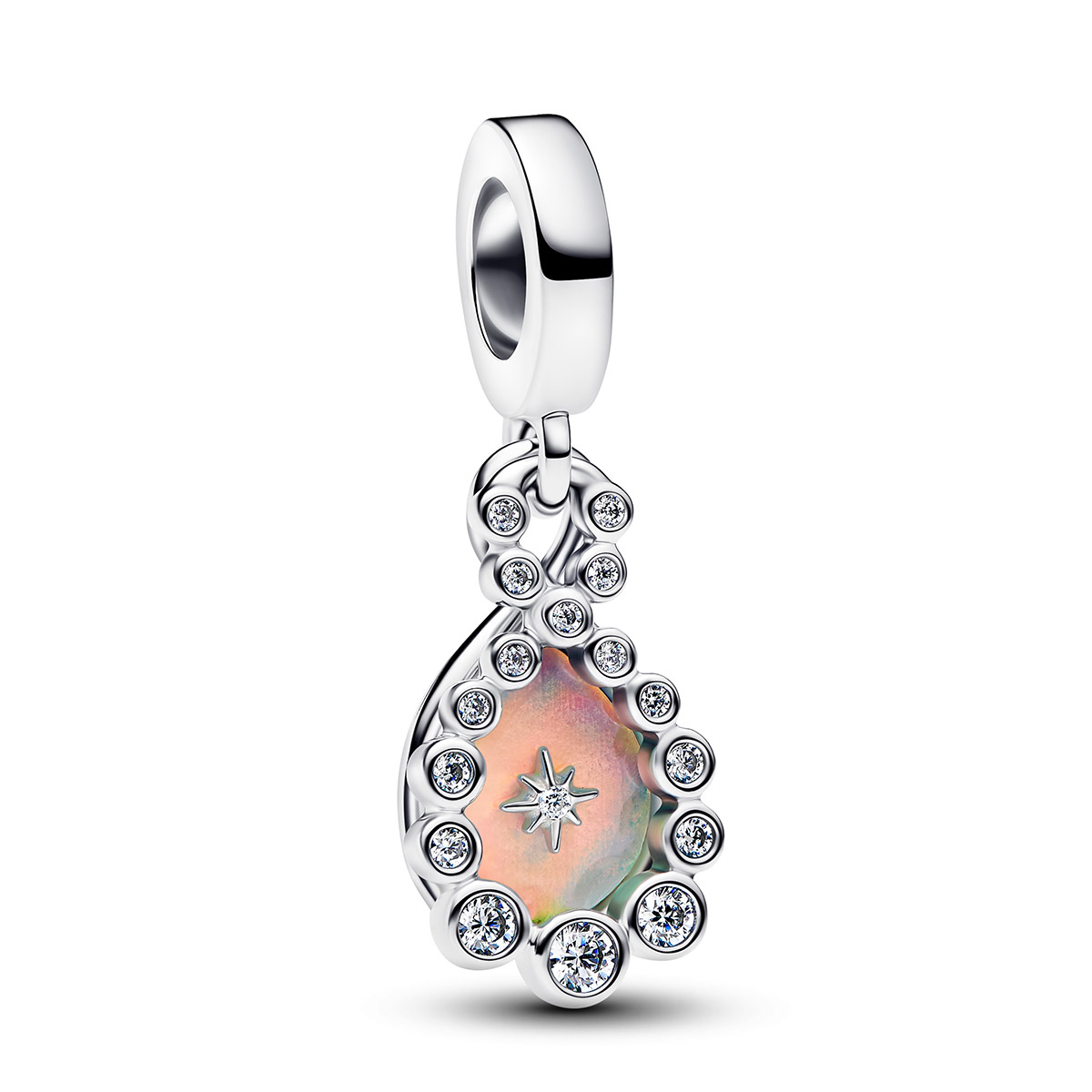 Ge dina smycken en touch av sofistikering och naturlig glöd med Pandora Moments-berlocken. Berlocken träs genom hålet i berlocken på ditt Pandora Moments-halsband eller armband. Denna eleganta berlock är tillverkad av sterlingsilver och har en flerfärgad opalsten omgiven av en ram av glittrande klara stenar. Stjärnmönstret inristat i stenens mitt symboliserar hopp och ljus. Berlockens storlek är 13,9 x 8 mm.