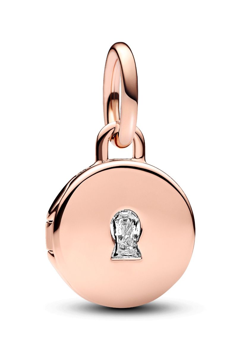 Pandora Moments öppningsbar och graverbar Love Locket Dangle Charm 14k roséguldpläterad berlock 783066C01 är en öppningsbar locketcharm för att förvara dina mest älskade minnen. Berlocken har en gravering på insidan och en enda syntetisk zirkonia på ytan. Looken avslutas med 14 karats roséguld. Pandora-smycken levereras i tillverkarens originalförpackning.