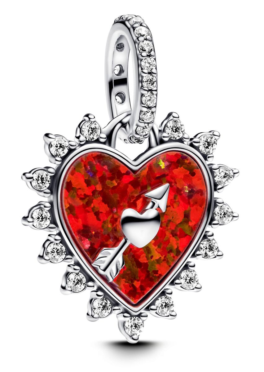 Pandora Moments röda hjärta 793667C01 har klara ädelstenar, vita zirkonia och röd emalj. Hjärtats mitt är dekorerat med en kärlekspil, vilket gör det till en perfekt gåva till en älskad person.