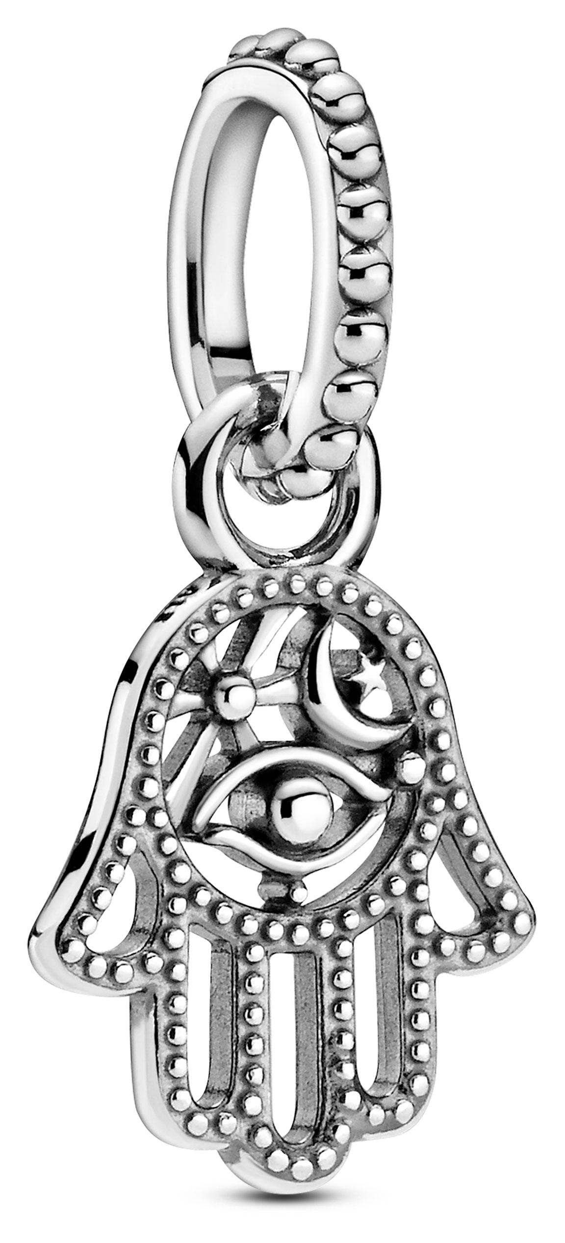 Pandora Passion charm Protective Hamsa Hand 799144C00 är tillverkad i sterling silver. Hamsa berlocken är dekorerad med silverpärlor.