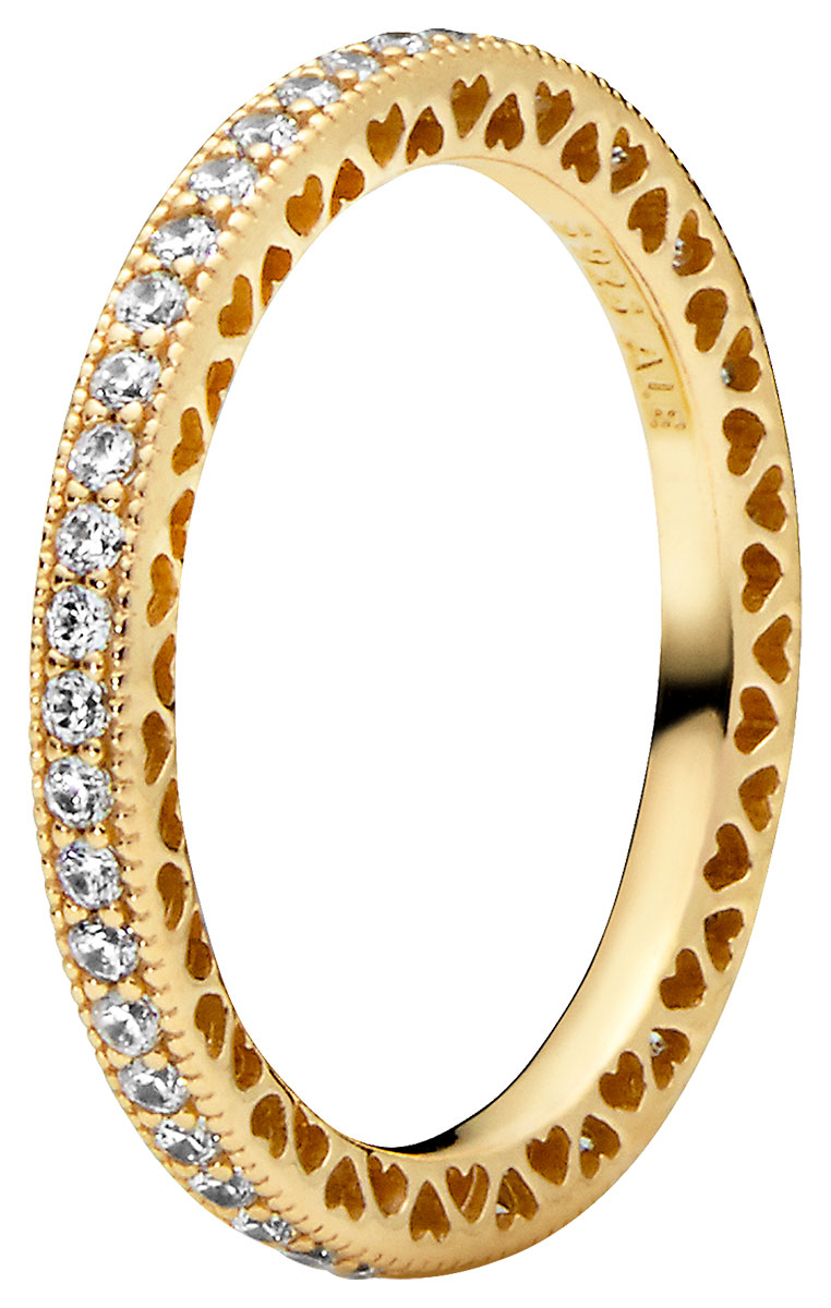 Pandora Sparkle & Hearts 168655C01 är en vacker silverring pläterad med 14k gult guld. Ringen är dekorerad med klara kubiska zirkoner. Den här Pandora-ringen kan kombineras med vilken annan ring som helst för att skapa en fantastisk helhet. Pandora-smycken levereras i originalskrinet från tillverkaren.