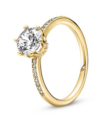 Pandora Sparkling Crown 168289C01 Solitaire ring med 14 K guld plätering och en vit kubisk zirkonia sten och 16 st kubisk zirkonia-stenar runtom sig. Pandora smycken skickas hem i tillverkarens originalförpackning.