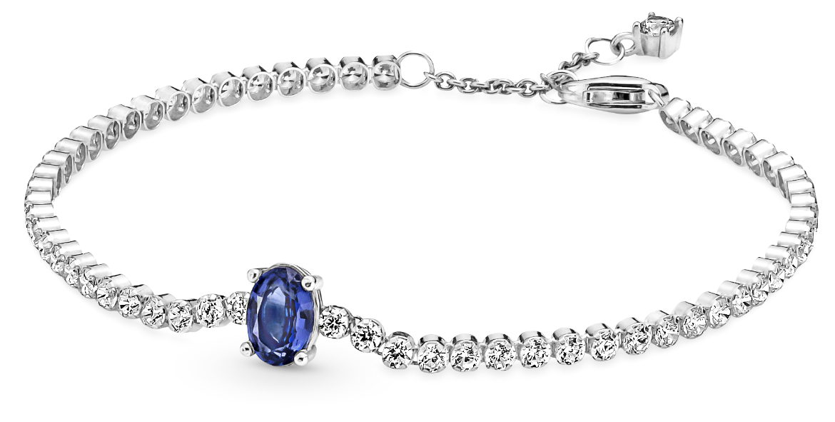 Ett tidlöst Pandora Sparkling Pavé Tennis Bracelet armband 590039C01 i sterling silver med vita briljantslipade stenar och en ovalformad blå kristall. Bär ensam eller kombinera med andra Pandora smycken i samma serie.