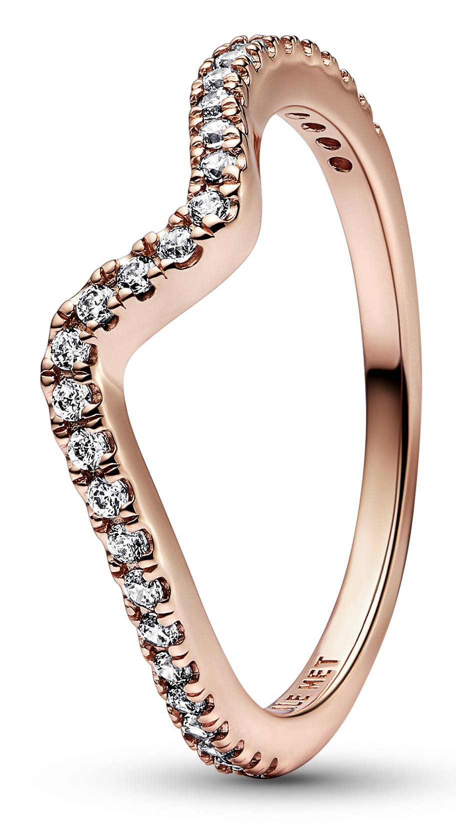Pandora Timeless Ring Stackable Sparkling Wave 14K rose ring 182539C01 vågformade ringen är pläterad i 14-karat roseguld och ytan är helt täckt med klara kubiska zirkoner. Pandora ringar levereras i tillverkarens originalförpackning.