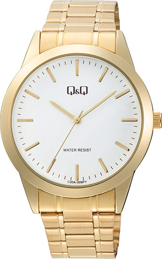 Q&Q C00A-009PY är ett fint klassiskt armbandsur för män, tillverkat av hållbar metallegering. Urtavlan är 40 mm bred och 10 mm tjock. Mineralglaset skyddar den vita urtavlan med guldiga visare och index. Bredden på metallarmbandet vid fästpunkten är 20 mm och längden är 150 - 220 mm. C00A-009PY armbandsuret har ett batteridrivet Miyota kvartsverk och har en vattentäthet på 30 m / 3 atm, vilket innebär att det är stänkskyddat.