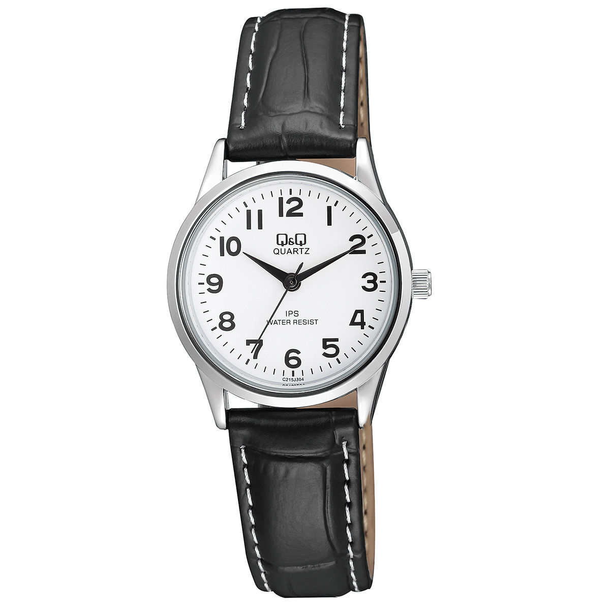 Q&Q C215J304Y är ett elegant och mångsidigt damarmbandsur, som kombinerar en silverfärgad stålboett, ett svart konstläderarmband och en klarvit urtavla som skyddas av mineralglas. 30 mm bred boett gör det till ett elegant men praktiskt val. Armbandsuret har ett batteridrivet Miyota-kvartsurverk och är stänksäkert (30m/3atm), vilket skyddar det mot lätt fukt.