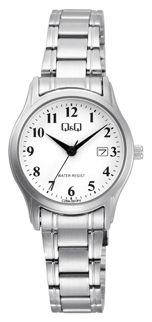 Q&Q C28A-001PY armbandsur för kvinnor är tillverkat av hållbar legering och har en 28 mm bred och 9,2 mm tjock boett med en totalvikt på 51 gram. Ett tåligt mineralglas skyddar den vita urtavlan med datum vid klockan 3. Armbandet i rostfritt stål är 14 mm brett vid fästpunkten och 130 till 190 mm långt. Klockan drivs av ett batteridrivet kvartsurverk av märket Miyota 2015 med en gångtid på ca 3 år. C28A-001PY är vattenresistent till 30 m/3 atm, vilket innebär att den är stänkskyddad.