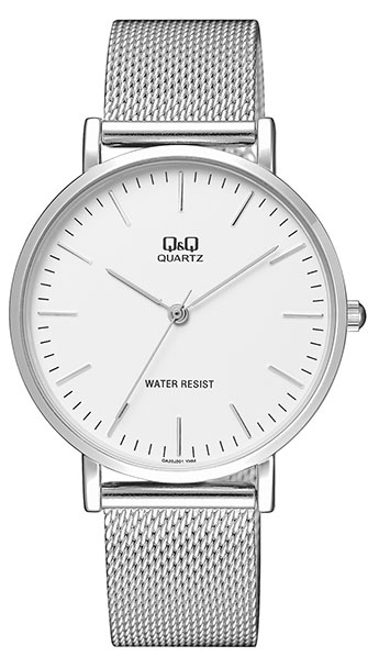 Q&Q QA20J201N är en klassisk rund herrklocka med en stor, vit urtavla skyddad av mineralglas och silverfärgade visare och index. Boetten, tillverkad av metallegering, är 40 mm bred och 8 mm tjock. Bredden på metallarmbandet vid fästpunkten är 18 mm och längden är 160 - 200 mm. QA20J201N-armbandsklockan har en vattentålighetsklass på 30 m / 3 atm, vilket innebär att den är stänksäker.