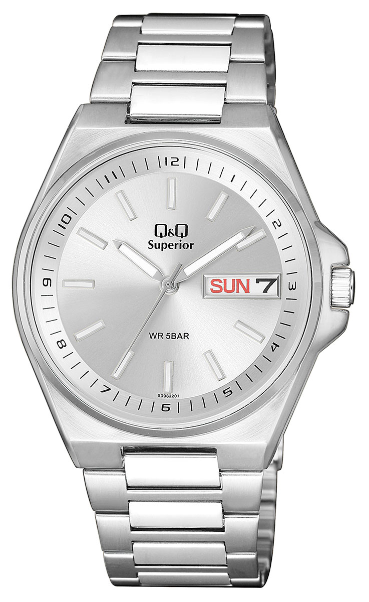 Q&Q S396J201Y är ett snyggt armbandsur för män tillverkat i rostfritt stål. Klockans kropp mäter 40 mm i bredd och 10 mm i tjocklek. Klockan har självlysande index och visare för att hjälpa dig att läsa av urtavlan i mörkret. Klockans totalvikt är 98 gram. Ett tåligt mineralglas skyddar den silverglänsande urtavlan med datum- och veckodagsvisning vid klockan 3. Ståalarmbandet är 12 mm brett vid fästpunkten och 160 till 210 mm långt. S396J201Y drivs av ett batteridrivet Miyota 2405 kvartsurverk och har en vattentäthetsklassificering på 50m/5atm, vilket innebär att den har begränsad vattentäthet (simning rekommenderas inte).