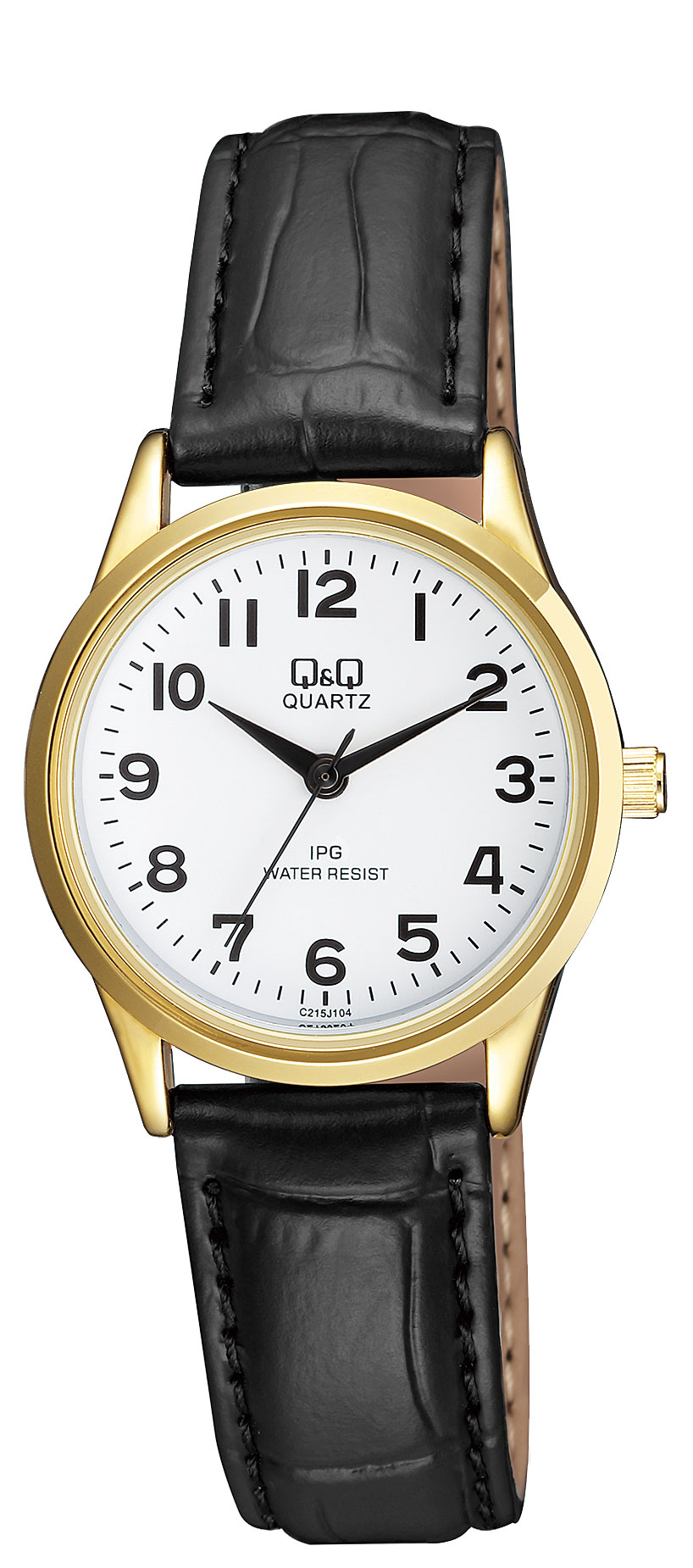 Q&Q C215J104Y är ett elegant och mångsidigt armbandsur för kvinnor som kombinerar en guldfärgad stålram, ett svart syntetiskt läderband och en klar vit urtavla skyddad av mineralglas. Den 30 mm breda ramen gör klockan till ett stilrent och praktiskt val. Armbandsuret har ett batteridrivet Miyota 2035 quartz urverk med en livslängd på ca. 3 år. Klockans vikt är endast 23 gram och den är stänksäker (30m / 3atm), vilket skyddar den från lätt fukt.