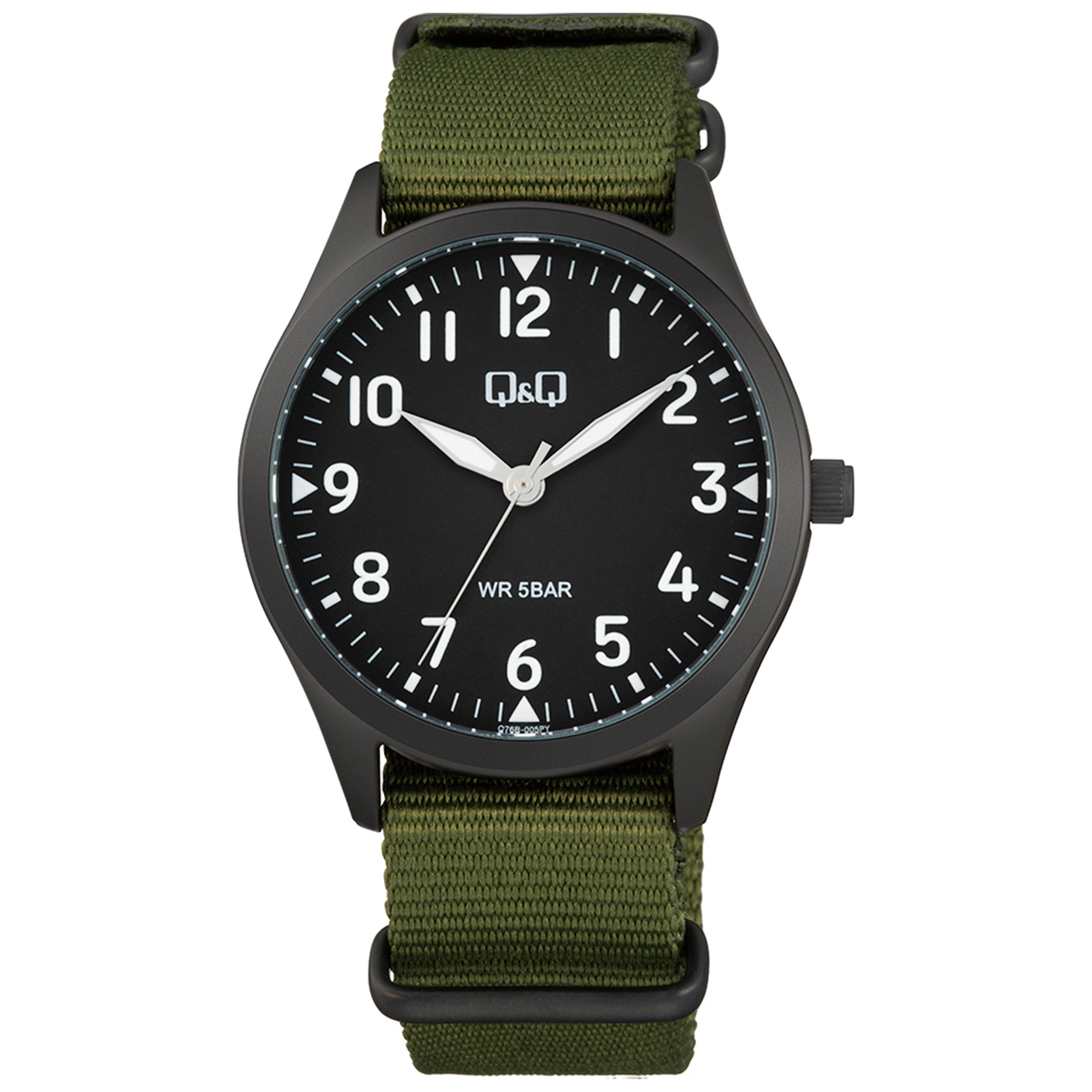 Q&Q Q76B-005PY är ett militärinspirerat armbandsur för män som kombinerar enkel design med praktiska egenskaper. Klockans svarta, mattlackade 39 mm boett och mörka urtavla skapar en solid, taktisk look som kompletteras av ett militärgrönt nylonarmband. Armbandet mäter 190 mm i längd och 20 mm i bredd. Urtavlan har stora, klara vita siffror och visare som ger utmärkt läsbarhet vid en snabb blick. Sekundvisaren framträder subtilt i vitt och armbandets lätta material gör klockan bekväm att bära varje dag.