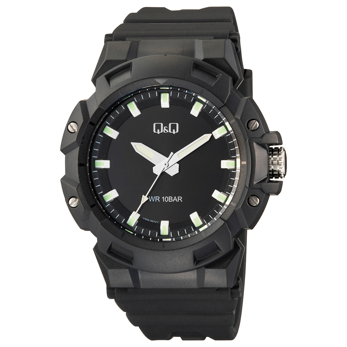 Q&Q V40A-001VY är ett armbandsur för män med en robust design. Klockans svarta, kantiga 47 mm plastboett och 20 mm breda, 210 mm långa gummirem skapar ett djärvt och maskulint utseende. Klockan är vattentålig till 100m/10atm, vilket gör den lämplig för simning och snorkling. Det batteridrivna kvartsurverket säkerställer tillförlitlig och exakt tidtagning, medan akrylglaset skyddar urtavlan från vardagliga stötar.