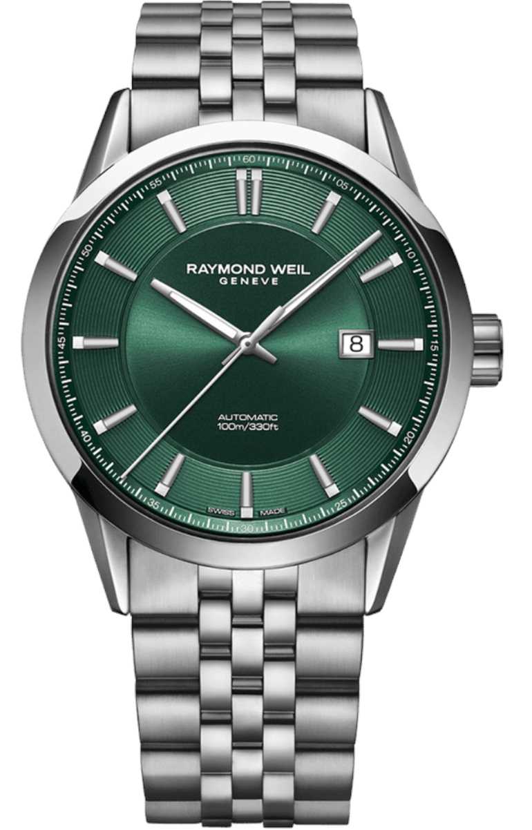 Raymond Weil Freelancer 2731-ST-52001 är det perfekta valet för en all-around klocka. Med en enkel och ren design ser den här klockan snygg ut på din handled oavsett om du är på väg till fest eller kontor. Schweiziska Raymond Weil-klockor är kända för sin kvalitet, och denna armbandsur är tillverkad helt i rostfritt stål. Den gröna sunray-urtavla pryds av mycket tydliga index, ett stort datum klockan 3 och en separat sekundskala på urtavlans ytterkant. Urtavlan skyddas av ett safirglas, och klockan drivs av et automat urverket RW4200 med 38 timmars gångreserv. Mekanismen kan också beundras genom det öppna bakboett. Raymond Weil Freelancer 2731-ST-52001 levereras med två års garanti, som kan utökas till tre års garanti genom att registrera klockan Raymond Weils webbplats.