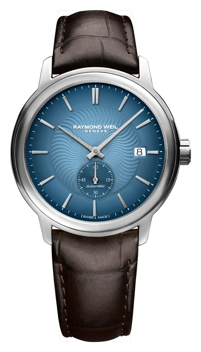 Raymond Weil Maestro 2238-STC-50001 är en elegant automatisk herrklocka med en 39 mm bred boett i silverfärgat 316L rostfritt stål. Det svarta krokodilmönstrad bandet är tillverkat av äkta läder. Under safirglas finns en blå urtavla med en subtavla för sekunder och ett datum klockan vid 3. Klockan Raymond Weil 2238-STC-50001 har en vattentäthetsklassning på 50m/5atm, vilket innebär att den har begränsad vattentäthet (rekommenderas inte för simning). Raymond Weil 2238-STC-50001 levereras i tillverkarens originalfodral. Klockan levereras med en två års garanti, som kan utökas till en tre genom att registrera klockan på Raymond Weil hemsida.