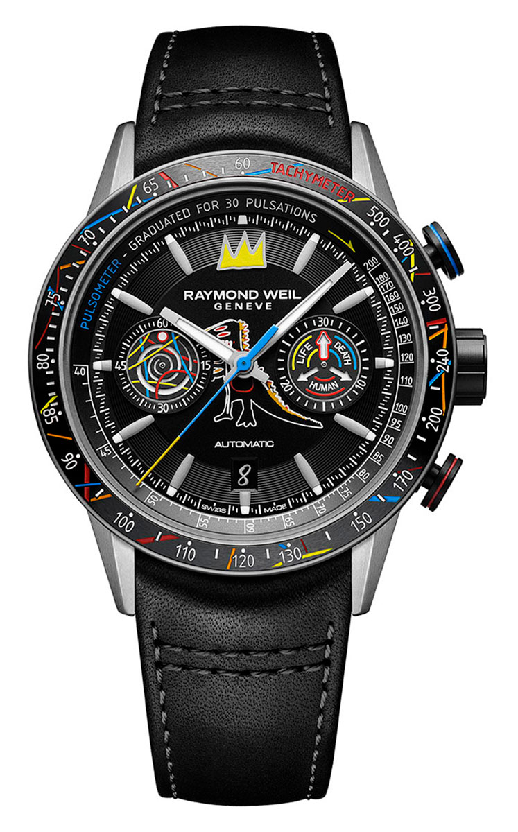 Raymond Weil X Basquiat Limited Edition 7780-TIC-JMB01 kronografklocka är en hyllning till konstnären Jean-Michel Basquiats användning av färger och neo-expressionistiska världssyn i hans målningsstil från 1980-talet. På urtavlan finns ett av Basquiats mest kända verk, "Pez Dispenser", som föreställer en kronbärande dinosaurie. Sidoknapparna pryds också av Basquiats ikoniska symboler: dollartecknet och copyright-symbolen. Armbandsurets färgschema och mönster är särskilt inspirerade av Basquiats berömda målningar av tribalism, som vanligtvis var fyllda med olika ord, koder, logotyper eller diagram.