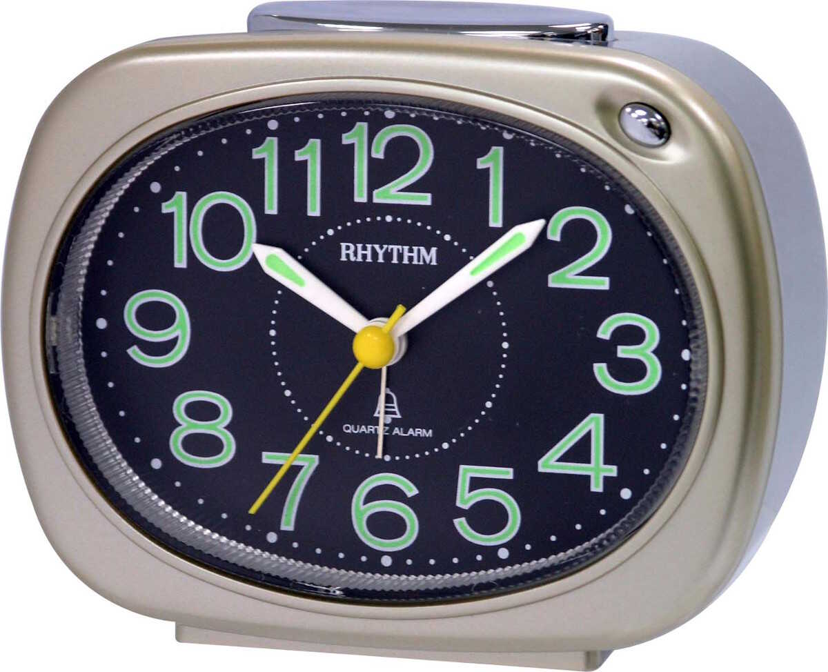 Rhythm CRA814-NR18 guldfärgad väckarklocka har en skjutbar sekundvisare, alarm, snooze och belyning. Plastkroppen mäter 11,5 x 9,5 x 6,5 cm och väckarklockan väger 190 g. Förpackningen innehåller ett C-batteri. Alarmklockor från Rhythm garanteras i ett år.