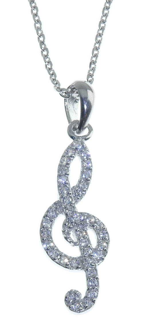 Klavhalsbandet är tillverkat av rhodinerat 925 sterling silver. Den har en 1 mm tjock kedja som är 45 cm i längden. Hängsmycket har en vacker klav nyckel med gnistrande zirkoner. Hänget är 27 mm högt och 10 mm bredd, och den rodiumplätering motverkar att smycket oxiderar. Med det här eleganta halsbandet kan du glädja en vän eller älskad person som älskar musik eller arbetar inom musikområdet.