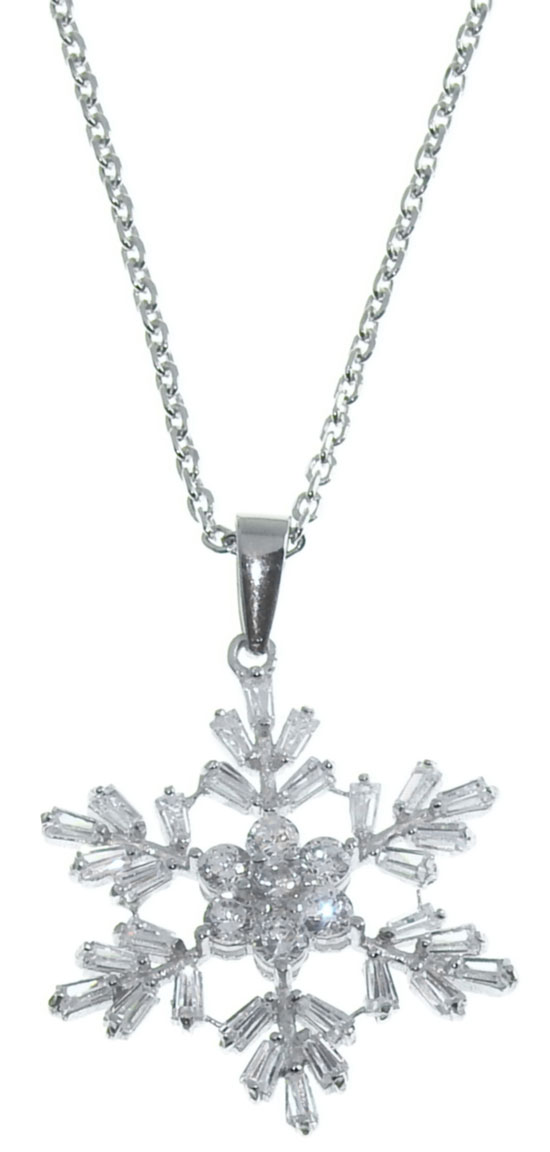 Ett snöflinga-hänge av 925 sterling silver och pläterat med rhodium. Halsbandet har en 1 mm tjock och 45 cm lång ankarkedja. Hänget är en 22x22 mm och den stor snöflinga dekorerad med gnistrande syntetiska zirkoner.Detta vackra smycke med vintertema passar både till vardags och högtider.