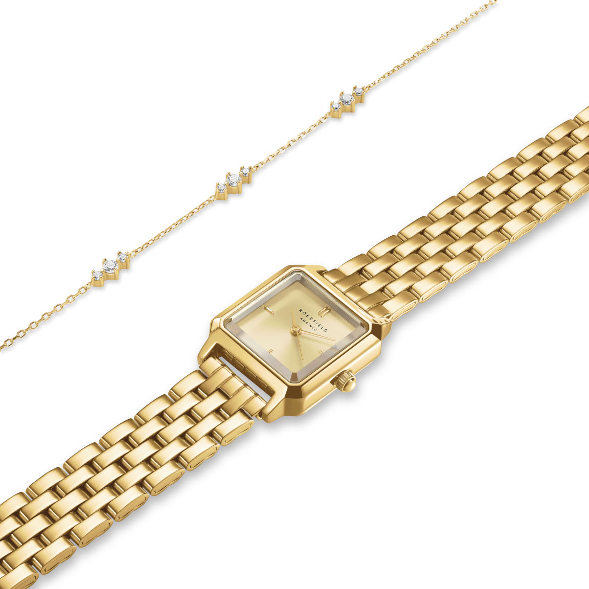 Rosefield Boxelle Champagne-urtavla, guldfärgad stålrem och armband BCGTC-X284 presentset innehåller ett fantastiskt guldfärgat Rosefield-armbandsur och en armbandskedja. Boettens storlek är 19,5x19,5 mm, tjocklek 7 mm. Armbandets längd är 145-175 mm och bredden från fästpunkten är 12 mm. Alla Rosefield-klockor har 2 års garanti och levereras i tillverkarens originalförpackning. Vi kan gravera baksidan av klockan med till exempel initialer och datum (max 10 tecken). Välj först gravyr och textstil som ska användas för graveringen och skriv informationen som ska graveras i fältet "text som ska graveras". Graverade produkter är inte berättigade till retur!
