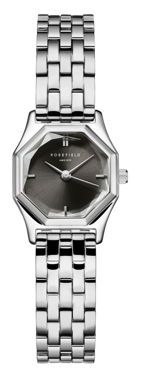 Den unika åttkantiga formen på damklockan Rosefield Gemme GGSSS-G05 påminner om en briljantslipad ädelsten. Den här lilla klockan är perfekt för en mindre handled eller för alla kvinnor som vill ha en subtil men ändå iögonfallande klocka. Den svarta urtavlan är 21,5 x 27,5 mm bred och 7 mm tjock och armbandet i rostfritt stål mäter 12 mm.