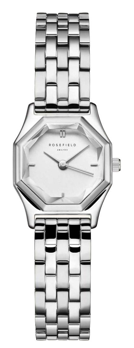 Den unika åttkantiga formen på damklockan Rosefield Gemme GWSSS-G04 påminner om en briljant slipad ädelsten. Denna lilla klocka är perfekt för en mindre handled eller för alla kvinnor som letar efter en subtil men ändå iögonfallande klocka. Den vita urtavlan mäter 21,5 x 27,5 mm i bredd, 7 mm i tjocklek och armbandet i rostfritt stål mäter 12 mm.