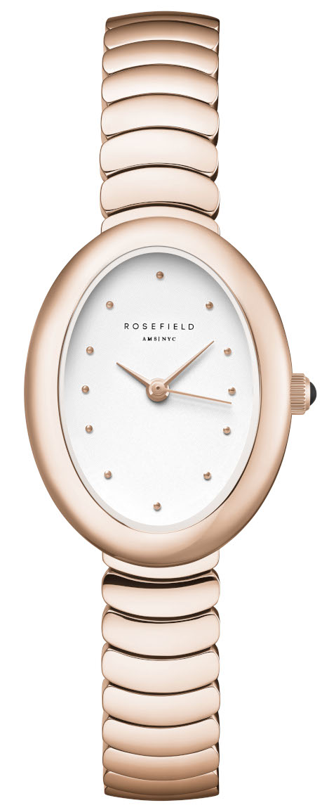 Rosefield Ovale OVWRSR-OV21 är ett elegant armbandsur för kvinnor. Boetten i roséguld, 22x29 mm, är tillverkad av mässing och tjockleken är 7,7 mm. Armbandet i roséguld är tillverkat av rostfritt stål och bredden från fästpunkten är 10 mm. Klockan drivs av ett japanskt Miyota-kvartsurverk. Under mineralglaset finns en elegant vit urtavla.