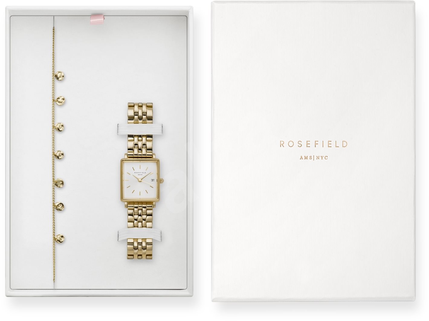 Rosefield presentasken innehåller den populära The Boxy guldfärgade klockan och ett vackert matchande armband. En perfekt gåva för din partner eller vän. Gratis gravering på baksidan av klockan.