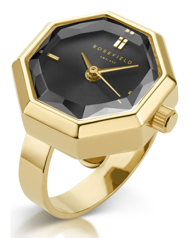 Rosefield The Studio Octagonal Watch Ring Black Gold SBGSG-O67 är en vacker ringklocka med en åttkantig guldfärgad boett som är 18 mm bred och 7,5 mm tjock. Materialet i boetten är rostfritt stål. Under mineralglaset skyddas en svart pärlemorurtavla. Rosefield The Studio Octagonal Watch Ring SBGSG-O67 är vattenskyddad till 30m/3atm.