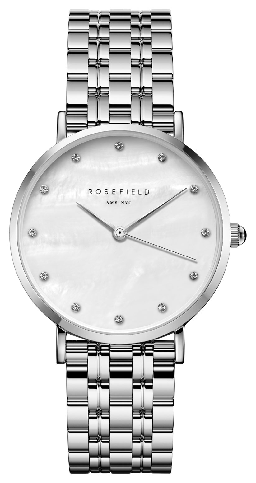 Silvrig Rosefield The Upper East Side Crystals MOP Steel Gold UWGSG-U31 är en iögonfallande damklocka med en sofistikerad look som pryds av träffsäkra inslag av pärlemor och kristaller. Boetten är 33 mm i diameter. På insidan sitter ett japansk Miyota 2035 urverk. Rosefield klockor skickas hem i tillverkarens originalförpackning.