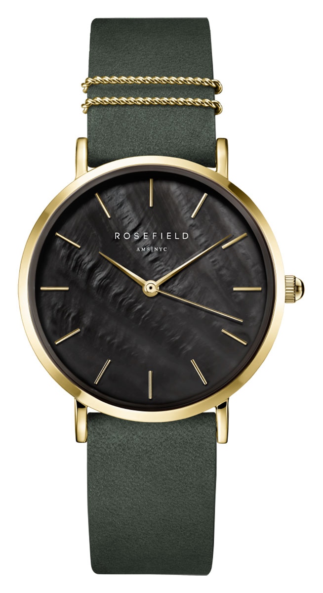 Rosefield The West Village Forest Green Black MOP Rosegold WBFLG-W95 har en elegant och smal boett och ett mjukt läderband i äkta nubuck. Särskilda detaljer sticker ut från mängden, som de graciösa metallringarna som pryds armbandet. Inspirationen till den här kollektionen kommer från det ikoniska och traditionellt rebelliska området West Village. Den här klockan har ett grönt läderband, en guldfärgad ram och en svart pärlemorurtavla. Boetten är 33 mm i diameter och 7 mm tjock, med en bredd på 16 mm vid fästpunkten och en justerbar längd på 135-180 mm. West Village WBFLG-W95 har en vattentäthet på 30m/3atm, vilket innebär att den är stänkskyddad.