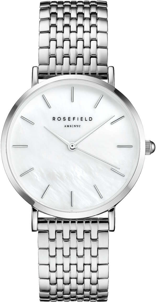 Rosefield UEWS-U22 The Upper East Side White MOP Silver har ett silverfärgat stålarmband och en silverfärgad boett. Urtavlan är gjord av ljus pärlemor, vilket ger klockan en elegant touch. Klockan är 33 mm bred och 7 mm tjock. Längden på armbandet kan justeras mellan 13-19 cm.