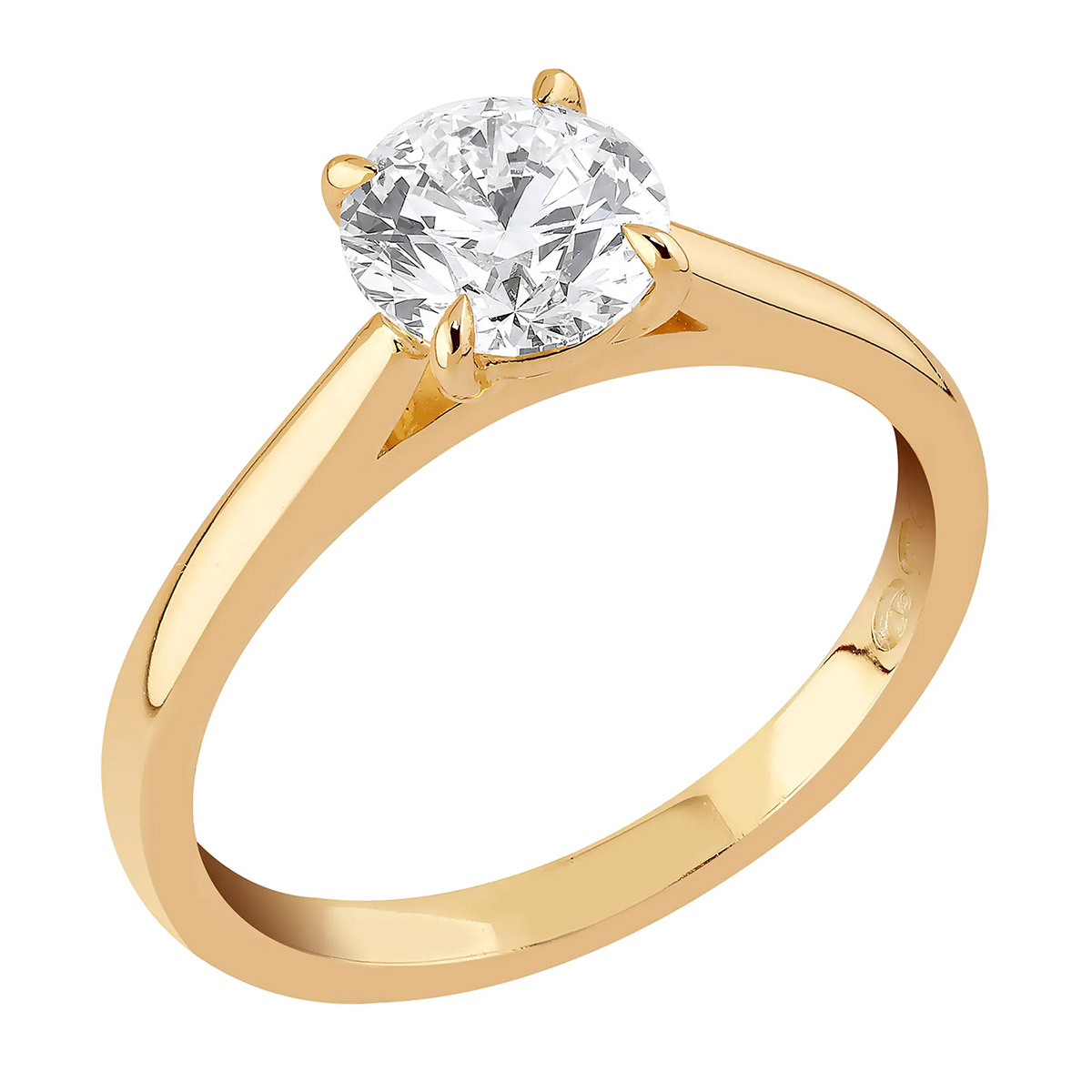 Kroppen smalnar mjukt av mot planteringen och dess profil är rundad, så kallad tunnformad. Kroppens bredd är cirka 1,9 mm, vilket ger ringen ett graciöst utseende och framhäver gnistan i den stora diamanten. Ramen är gjord av högkvalitativt 14-karats guld, vilket kompletterar den tidlösa och lyxiga ensemblen av pjäsen.