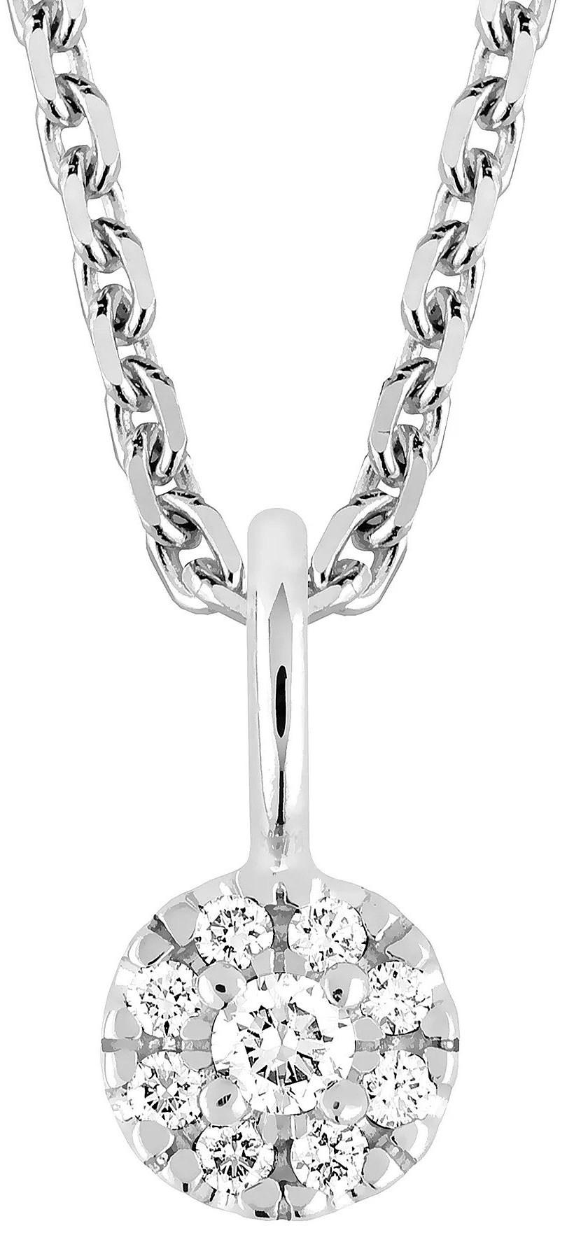 Ett vackert diamanthänge från Sandbergs Toivomuslähde-kollektion. Materialet i hänget är 14K vitguld. Guldet som används i Sandbergs smycken är det renaste certifierade återvunnet guld. Den totala vikten av de briljantslipade diamanterna i detta halohänge är 0,07 ct, med en större diamant i mitten, flankerad av 8 mindre diamanter. Hänget har en diameter på 5,1 mm och kedjan säljs separat!