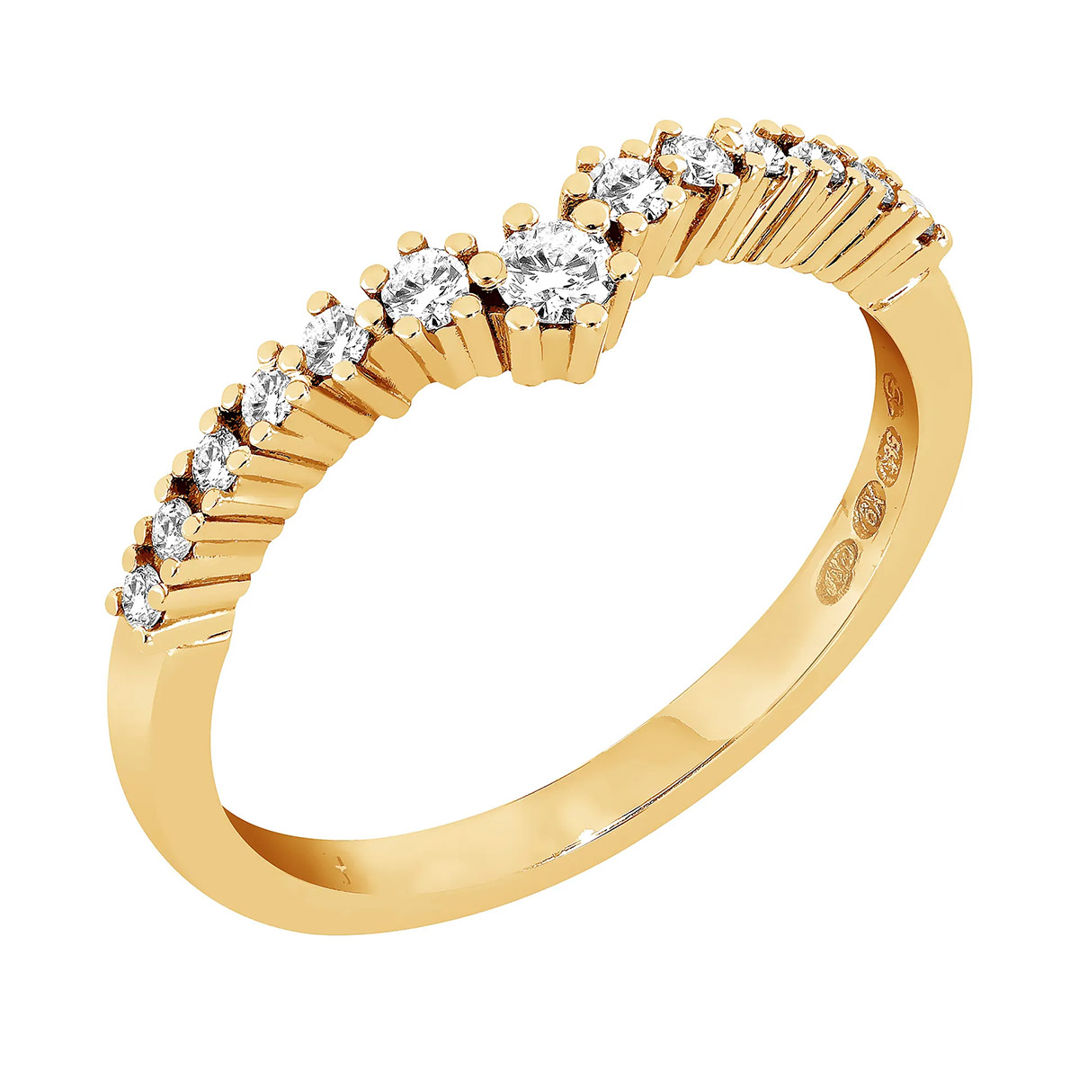 Sandberg Toivomuslähde diamantring 0.20ct M-15-8k är en snygg och praktisk förlovningsring som kombinerar skönhet och bestående värde. Denna ring är ett utmärkt val tillsammans med enstens- och haloringar, eftersom dess vackert böjda form skapar ett mjukt och slätt utseende som kompletterar elegansen hos andra smycken. Ringen är dekorerad med 13 briljantslipade diamanter, med en totalvikt på 0.20 karat. Diamanternas färg är en sällsynt färglös Top Wesselton, och deras briljantslipning framhäver diamanternas magnifika briljans, vilket skapar en vacker gnistra för ringen. Ringens form är både slående och snygg: dess smala kropp är 1.8 mm, men bredden ökar vid V-dekorationen, vilket ger ringen ett elegant och sofistikerat utseende. Ringen är tillverkad av 14 karats gult guld, och guldmaterialet som används är det renaste, certifierade återvunna guldet, vilket gör den till ett miljövänligt val. Denna ring är inte bara vacker, utan också ett ansvarsfullt val som återspeglar Sandbergs engagemang för hållbarhet och kvalitetshantverk.