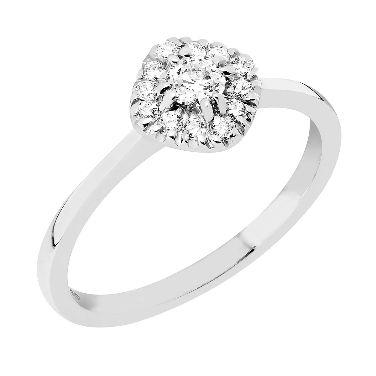 Sandberg Toivomuslähde V-707Bw diamantring med en sned halo är ett modernt och elegant val. Den något annorlunda halo-dekorationen ger ringen ett unikt utseende. Toivomuslähde halo-ringen sitter bredvid olika huggers- och row-diamantringar tack vare sin höga infattning. Den mittersta diamanten är en briljantslipad diamant på 0,15 ct, som är omgiven av 12 mindre diamanter. Diamanterna är av Top Wesselton/VS-kvalitet och deras totalvikt är 0,25 ct. Ringens material är 14 karat vitguld.