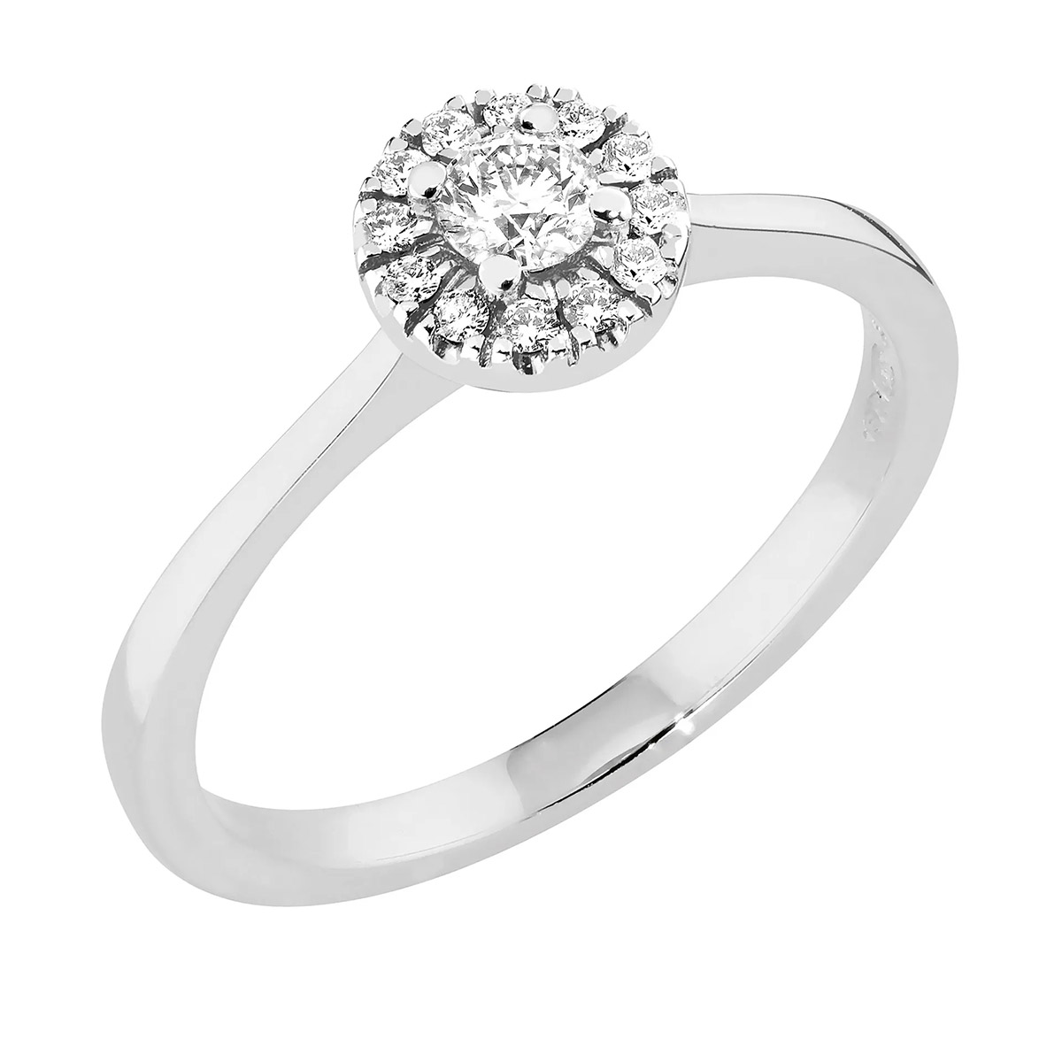 Sandberg Toivomuslähde V-687w är en fantastisk och imponerande halo-diamantring. Ringen är prydd med en 0,14 ct Top Wesselton-centerdiamant och 12 mindre diamanter runtomkring. Den totala vikten av briljantslipade diamanter är 0,22 ct. Briljantslipningen framhäver diamantens magnifika briljans. Ringen är tillverkad av 14 karat vitguld. Tjockleken på kroppen som smalnar av i mitten är 1,8 mm och storleken på den runda halo-dekorationen är 7 mm. Halo-dekorationen är satt så att det finns gott om plats för en sidoring under. Denna imponerande klassiska ring är perfekt som vigsel- eller förlovningsring. Guldet som används i smyckena är det renaste certifierade återvunna guldet.