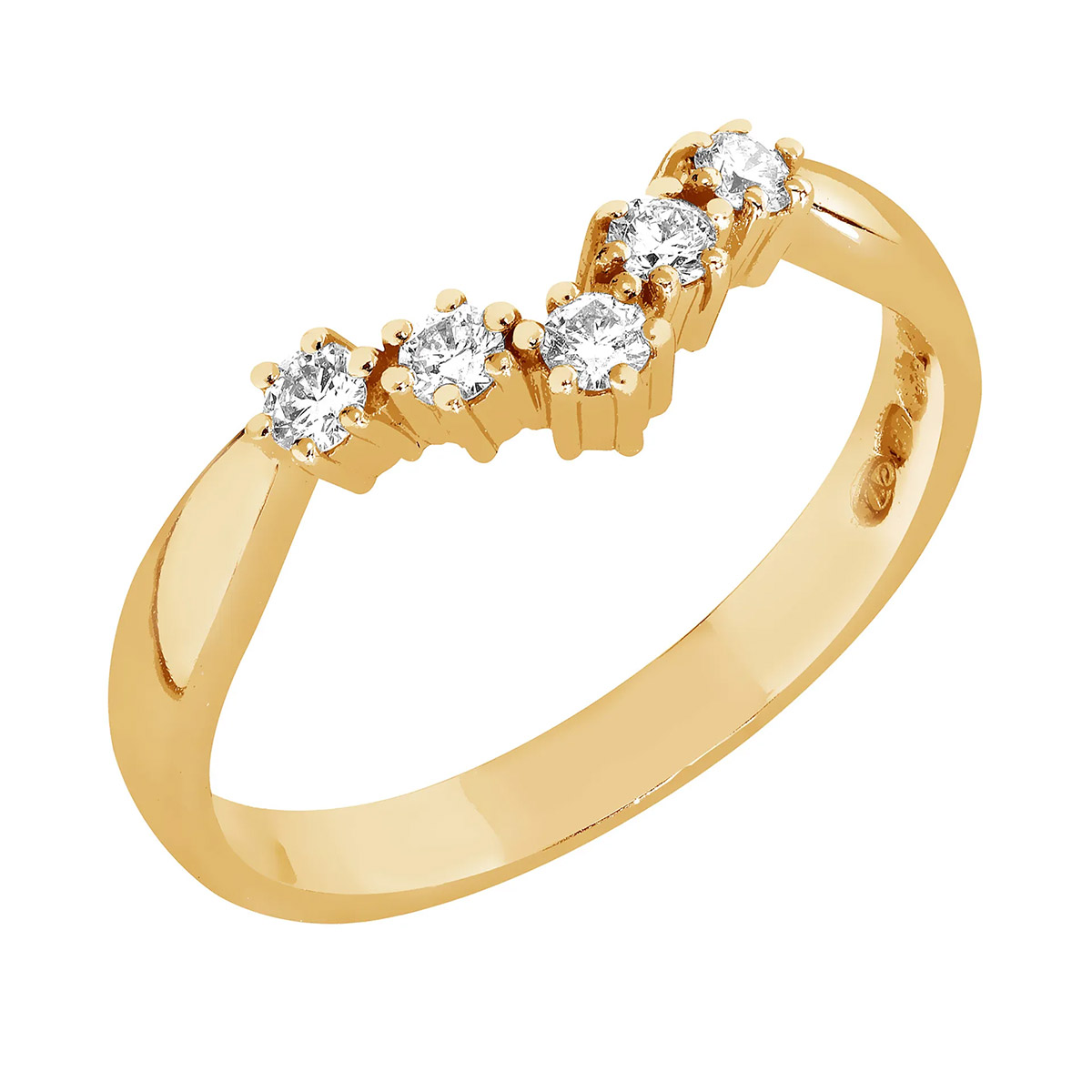 Sandberg Toivomuslähde M-12k är en slående omfamningsring som du kan placera bredvid exempelvis en haloring. Den vackert böjda ringen har 5 vackert glittrande briljantslipade diamanter, med en totalvikt på 0,18 ct. Briljantslipningen framhäver diamantens briljans. Diamanternas färg är den sällsynta färglösa Top Wesselton. Ringkroppens bredd är 2,5 mm och bredden vid V-dekorationen är 5,2 mm. Ringen är tillverkad av 14K guld. Guldet som används i Sandbergs smycken är det renaste certifierade återvunna guldet.