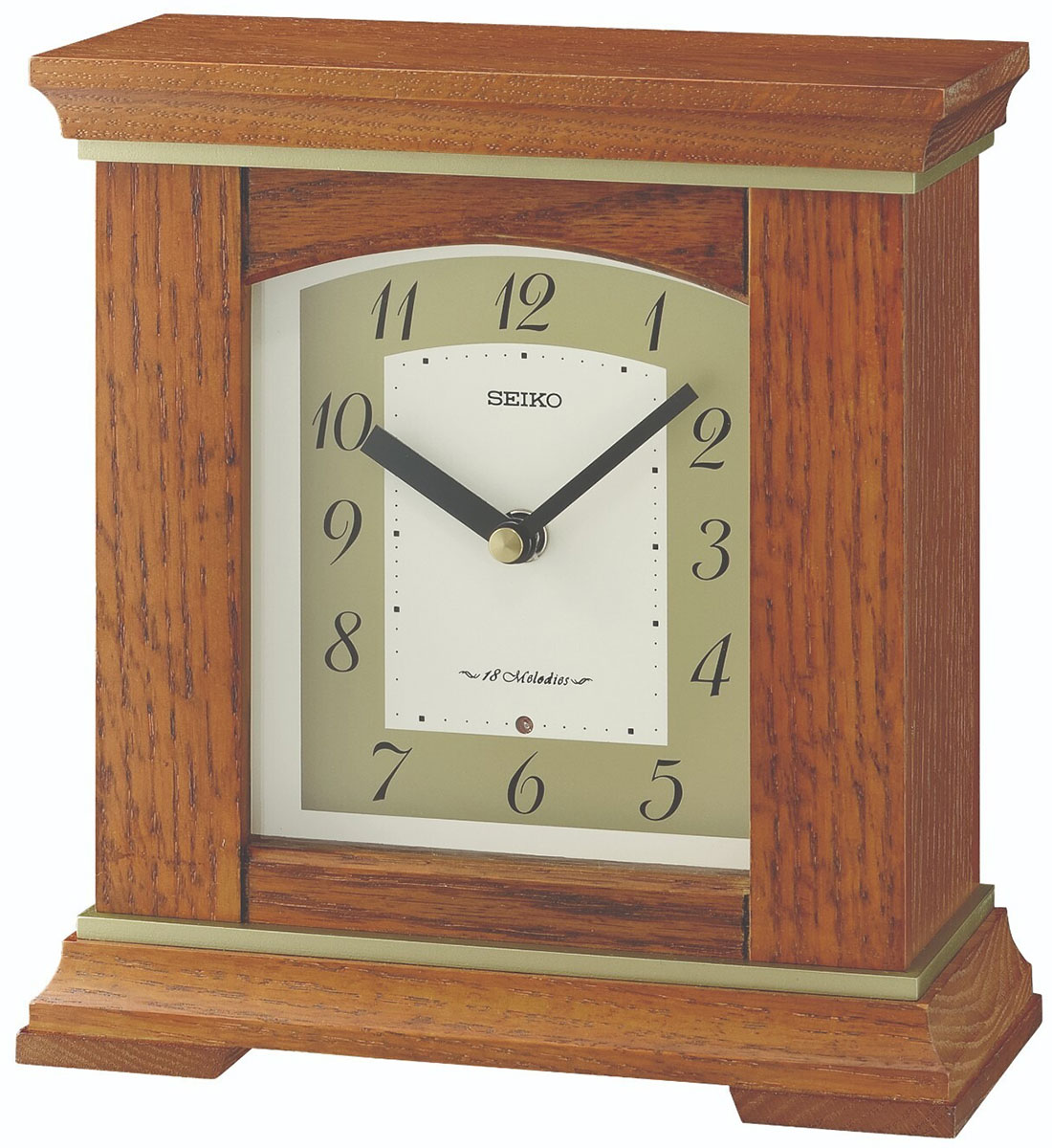 Den analoga bordsklockan Seiko QXW249B är en sofistikerad och snygg klocka för ditt skrivbord, skåp, öppen spis eller vilken yta som helst. Denna fantastiska bordsklocka har en ljus urtavla och en brun träram. Klockan har 18 melodier att välja mellan, volymkontroll från hög till låg, samt tim- och timsignaler. Klockan är 21,6 cm lång, 20,3 cm bred och 9 cm tjock. Bordsklockan, som drivs med tre AA-batterier, levereras i en låda med Seikos instruktionsmanual och ett års garanti.
