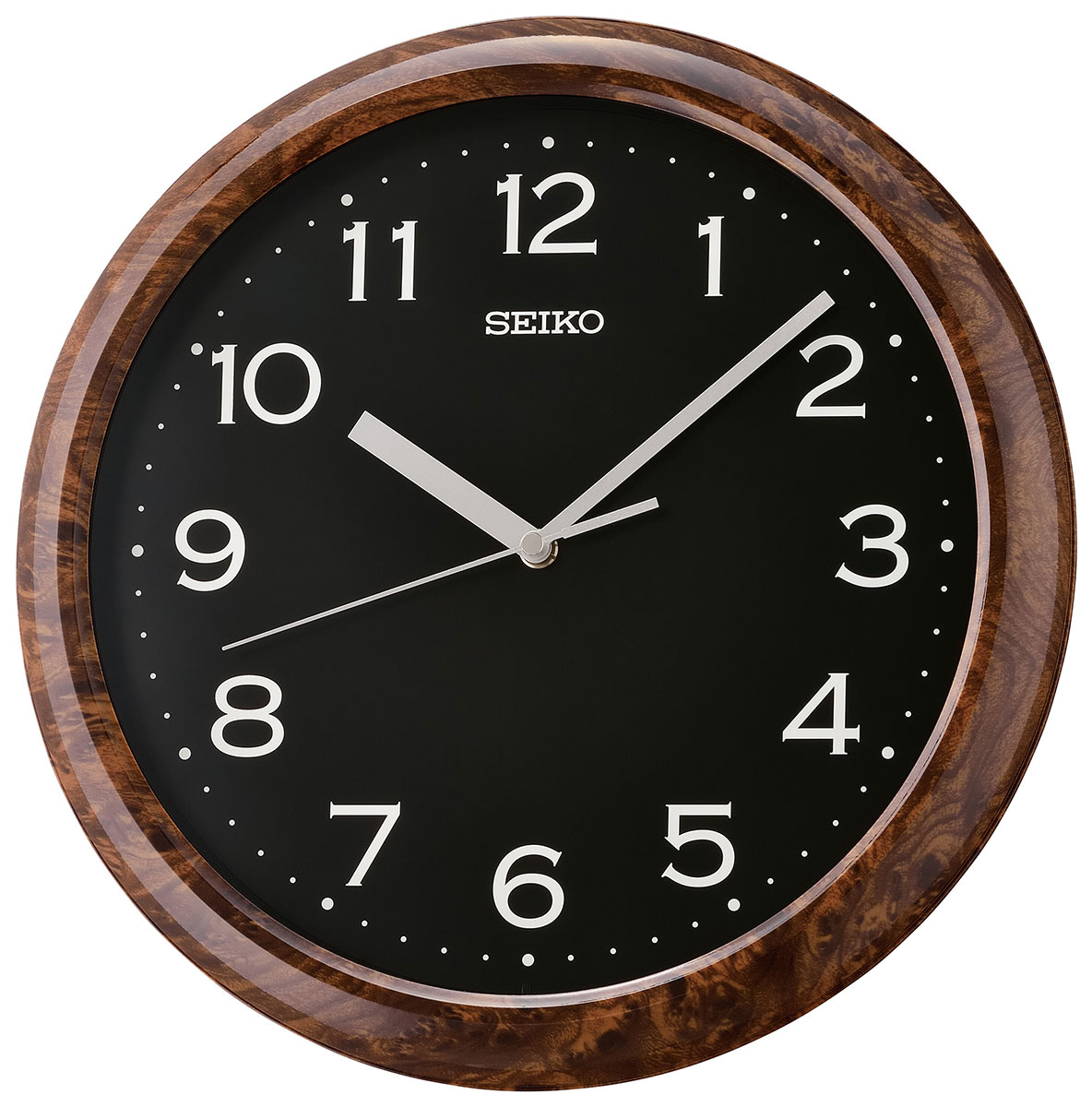 Seiko QHA014Z är en traditionell väggklocka med arabiska siffror, som passar fint på väggen i både hemmet och arbetsplatsen. Klockan är gjord av plast och har en brun ram och en svart urtavla mot vilken de vita visarna och siffrorna sticker ut. Urtavlan har en minut- och timvisare och en stadigt fortskridande tyst glidande sekundvisare. Baksidan av väggklockan har en öppen spets för enkel och smidig upphängning på väggen. Klockans diameter är 30 cm och tjockleken är 4,5 cm. Seiko QHA014Z körs på ett AA-batteri.