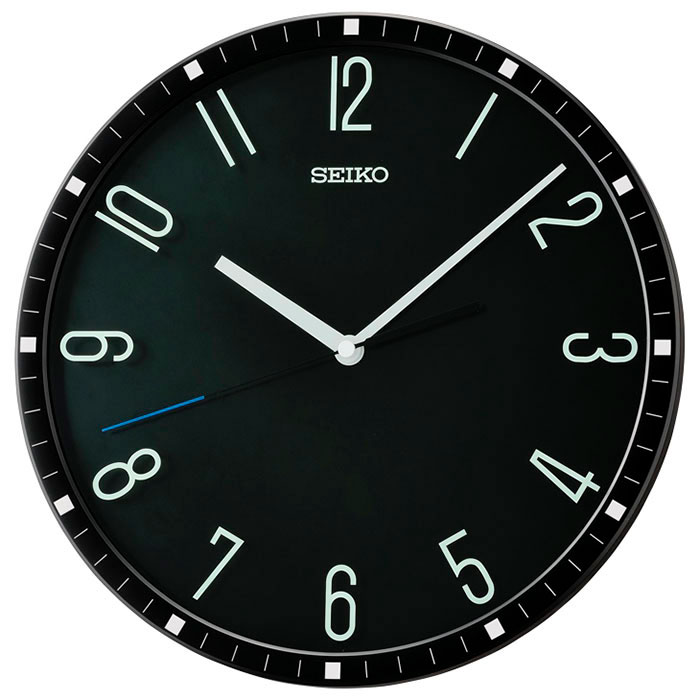 Väggklockan QXA818K ger stil till ditt hem och är perfekt för vardagsrum eller kök. Den svarta urtavlan har distinkta vita numeriska index, vita minut- och timvisare samt en tyst sekundvisare med glidande rörelse. Klockan mäter 31,1 cm i diameter och 3,9 cm i tjocklek. Seiko QXA818K drivs av ett enda AA-batteri.