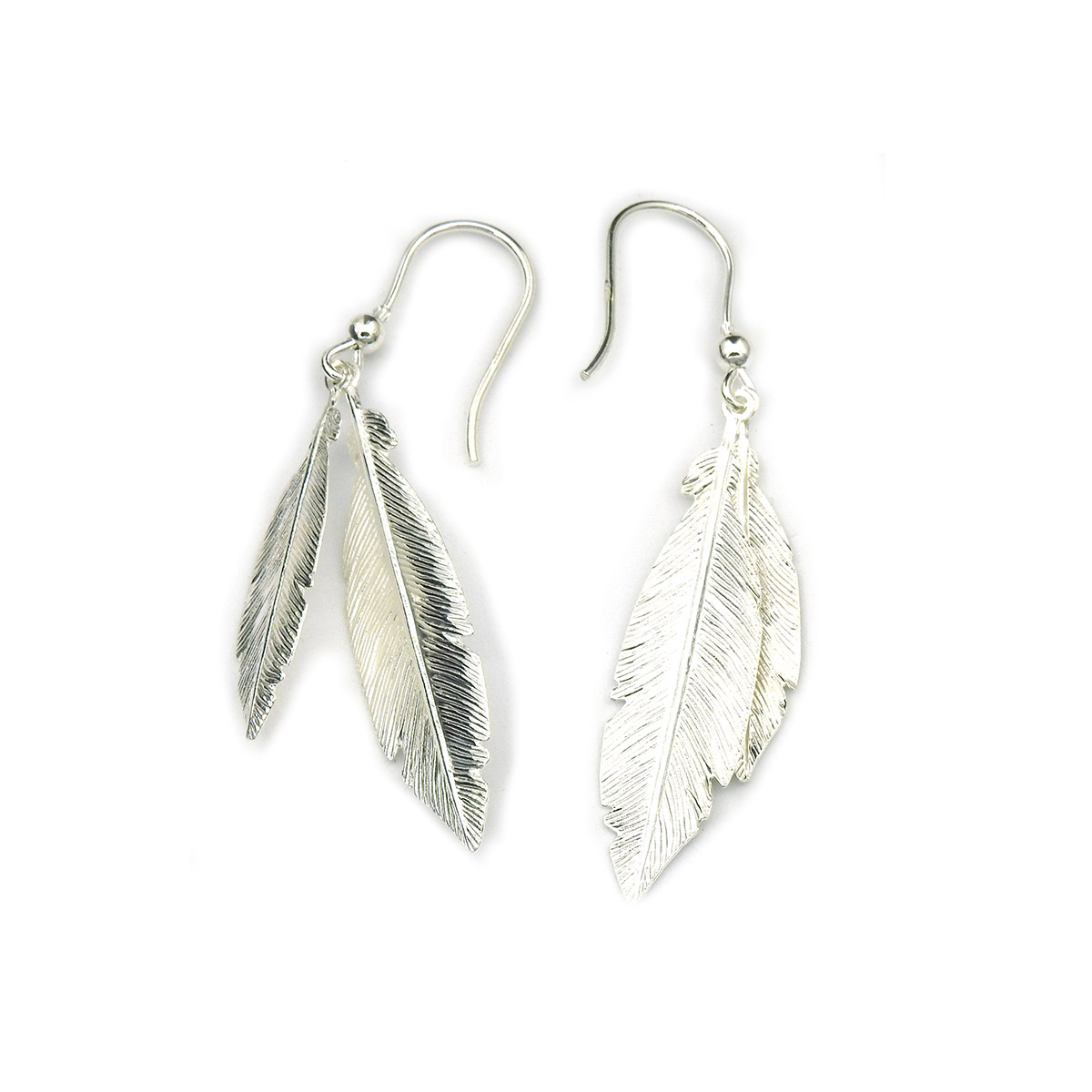 Dubbelörhängen med krok är mycket pråliga och ändå lätta att bära. Krokörhänget har två fjädrar i olika storlekar, varav den större mäter 40 x 10 mm. Örhängena är tillverkade av äkta silver.