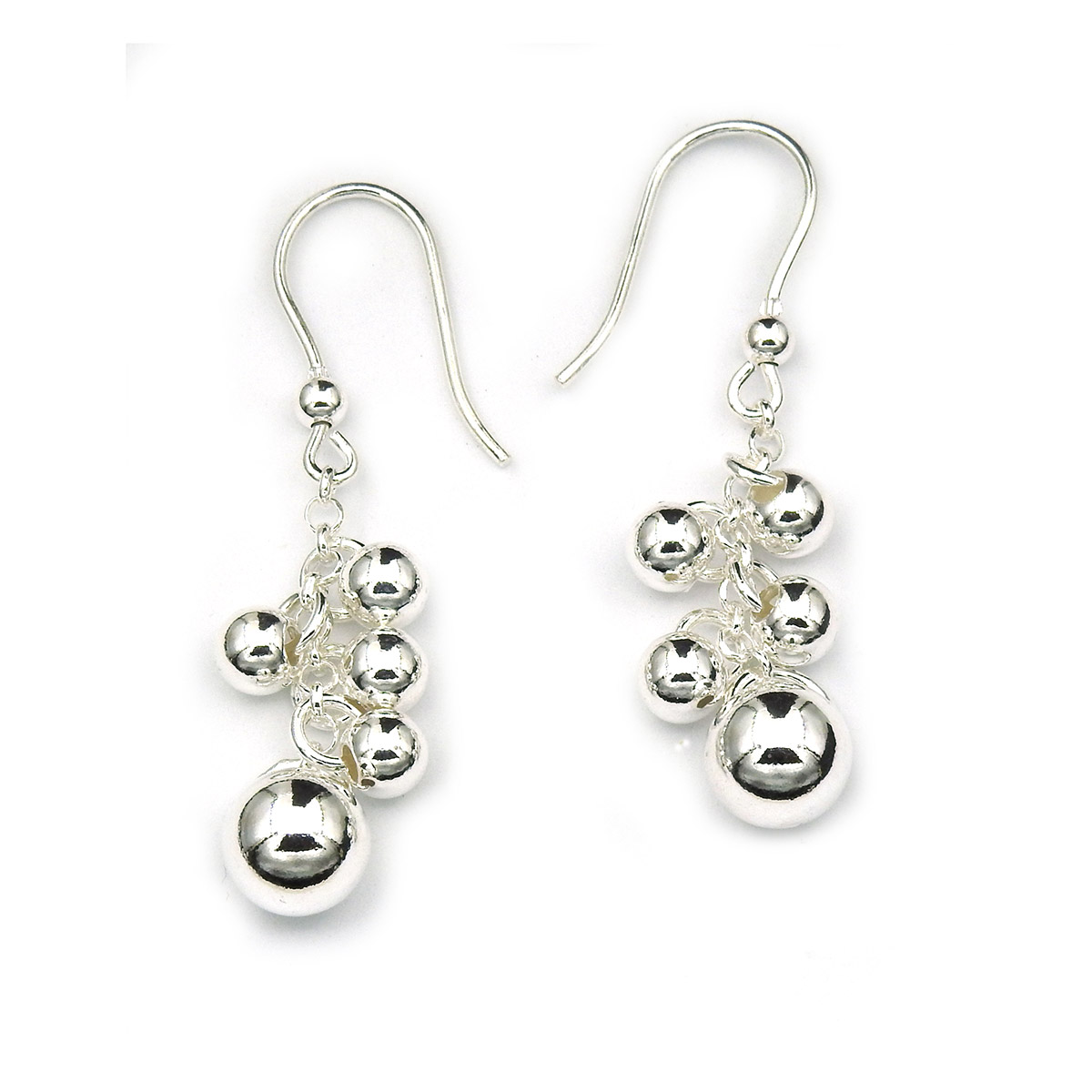 Dessa örhängen med krokformade kulor är roliga och har en imponerande storlek. De är dock lätta, så de är bekväma att bära. Örhängenas dekorativa del är 35 mm hög och den största kulan är 8 mm i diameter. Kulorna svänger fint på de dinglande örhängena. Tillverkade av äkta silver.