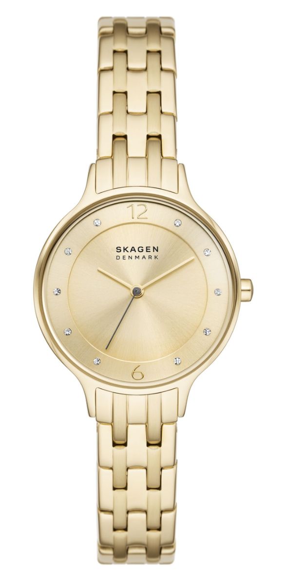Skagen Anita Lille yellow gold SKW3127 är en elegant damklocka med en 30 mm bred och 5 mm tjock boett i rostfritt stål. Armbandet på den här klockan är ett guldfärgat stållänk med en bredd på 12 mm vid fästpunkten. Den guldfärgade sunray urtavlan på Skagen Anita Lille yellow gold SKW3127 skyddas av mineralglas. Klockans index är dekorerade med juveler. Klockan är vattenskyddad till 50m / 5atm, dvs. den har begränsad vattentålighet (rekommenderas inte för simning). Skagen klockor, inspirerad av minimalistiska dansk design, levereras i tillverkarens originalförpackning, och har två års garanti.
