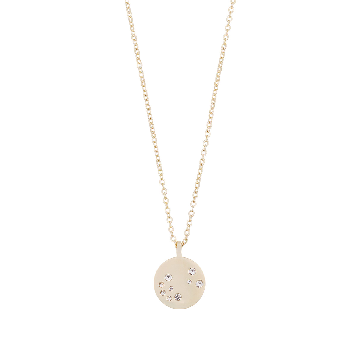 Snö of Sweden Sprinkles halsband ger en gyllene känsla till vardagsgarderoben. En guldpläterad mässingskedja och en 15 mm stor rund hänge, dekorerad med asymmetriskt placerade klara glasstenar, bildar en diskret men iögonfallande helhet. Halsbandets längd är 45 cm. Material: förgylld mässing.