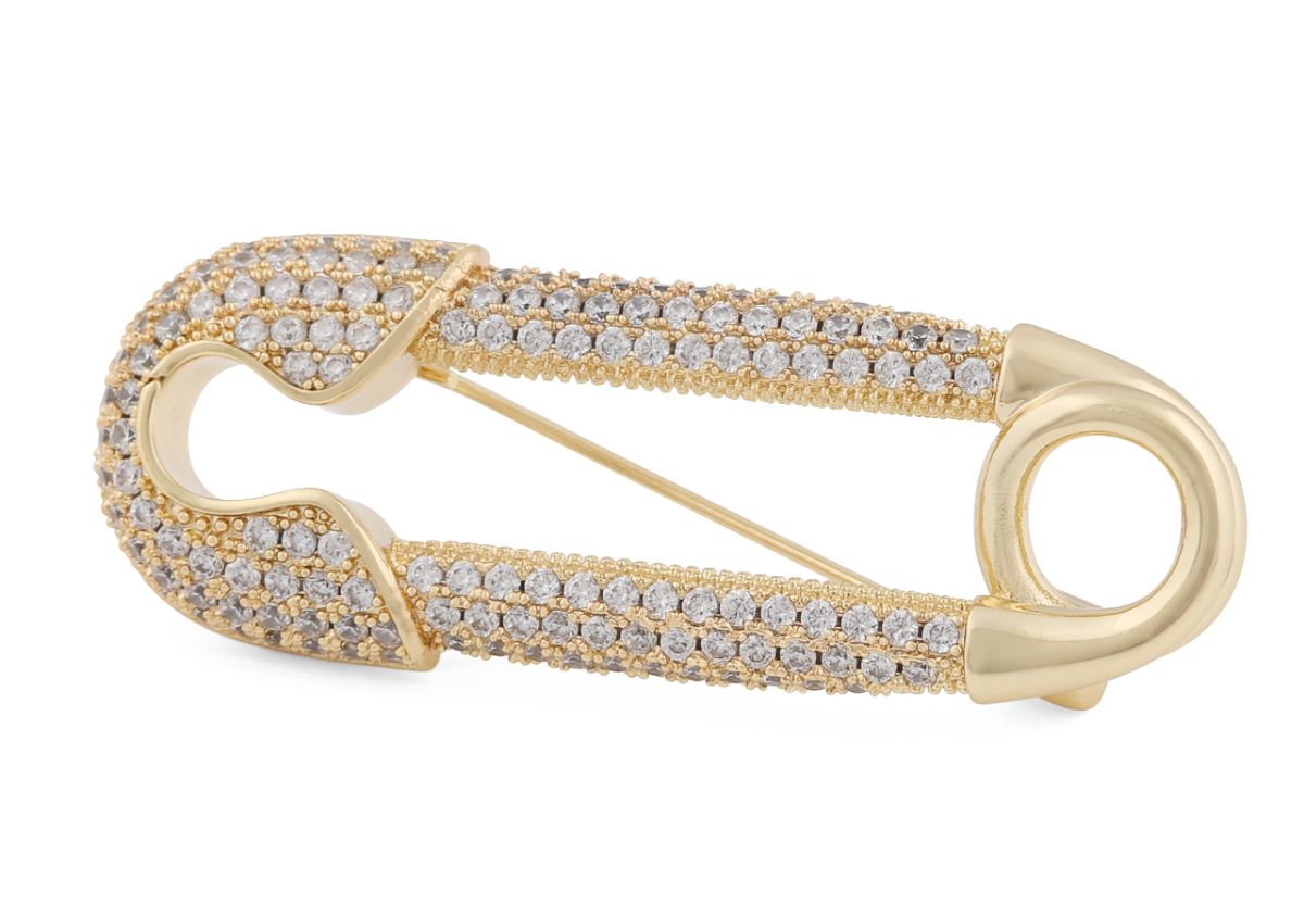 SNÖ of Sweden Stina säkerhetsnålsbrosch guld/klar 1336-9300251 hämtar sin stil från punkandan. Nålen är tillverkad av guldpläterad mässing och broschen är utsmyckad med syntetiska zirkoner. Broschen kan bäras som en traditionell brosch, som halsduksslips eller hatt, eller till och med hängas på ett band runt halsen som ett hänge.