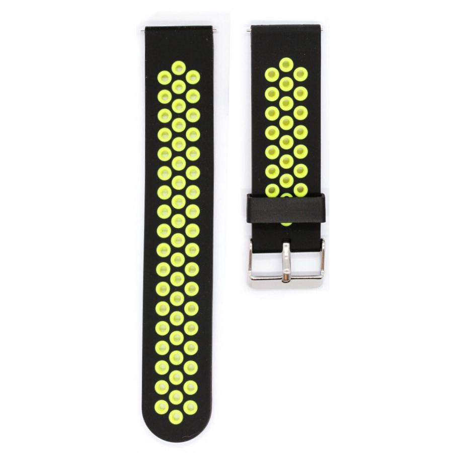 Det här svarta och gula silikonarmbandet är hudvänligt och andas bra. Det sportiga utseendet ger säkert en ny look till din klocka. Armbandet har ett snabbfäste som gör det enkelt att byta armband.