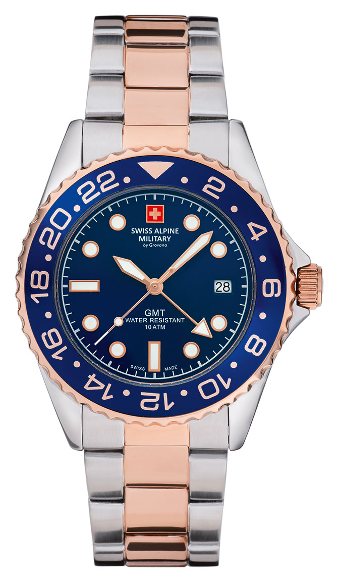 Swiss Alpine Military Master Diver GMT 7052.1155SAM är en stilren och tålig herrklocka. Klockan är tillverkad i rostfritt stål och safirglaset skyddar den smurf-urtavlan mot repor. Boettens bredd är 42mm och klockan visar datum. Denna klockan har ett Ronda Quartz RHQ 51524 H kvartsurverk. Klockan är vattentålig upp till 100m och den visar världstid. Swiss Alpine Military klockan har garanti upp till 3 år och de levereras i tillverkarens originalförpackning.